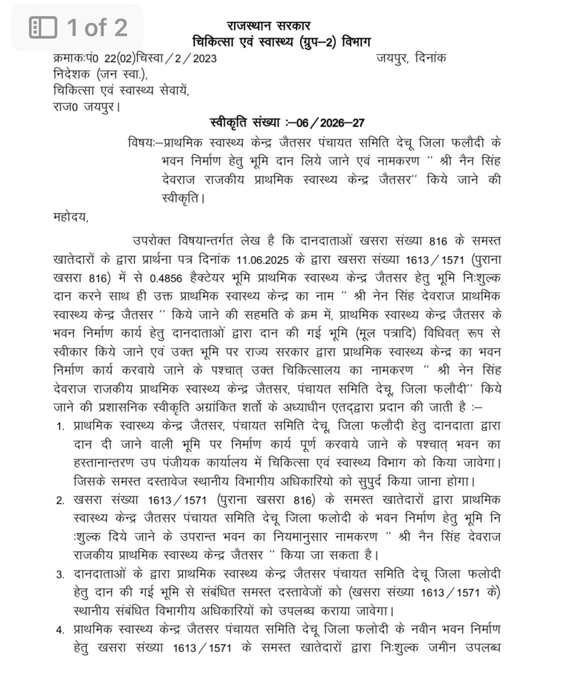 देचू उपखंड के जैतसर में बनने वाले प्राथमिक स्वास्थ्य केंद्र का नामकरण “श्री नैन सिंह देवराज राजकीय प्राथमिक स्वास्थ्य केंद्र, जैतसर” रखने को राज्य सरकार ने मंजूरी दे दी है।खातेदारों द्वारा दी गई नि:शुल्क भूमि पर बनने वाले इस स्वास्थ्य केंद्र को क्षेत्र के प्रतिष्ठित नाम से जोड़ने का निर्णय लिया गया है, जिससे स्थानीय […]