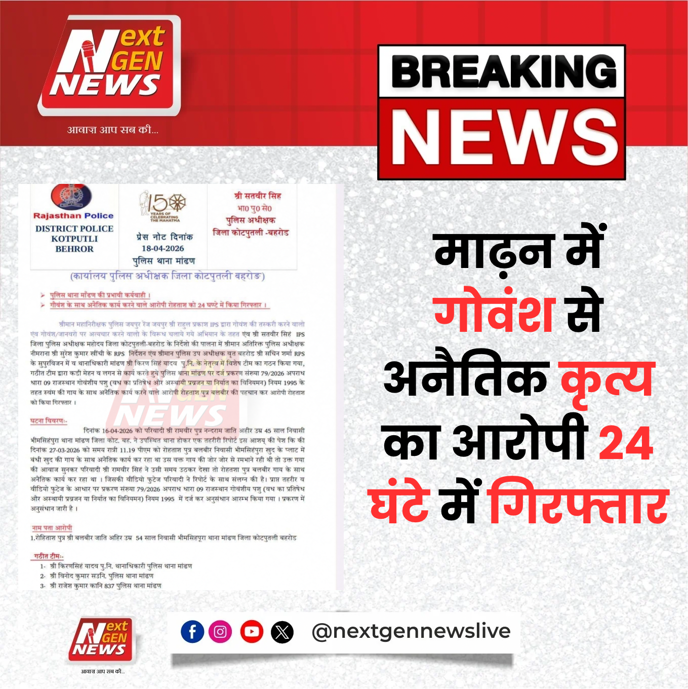 मांडण थाना पुलिस की बड़ी कार्रवाई: गोवंश के साथ अनैतिक कृत्य करने वाला आरोपी 24 घंटे में गिरफ्तार